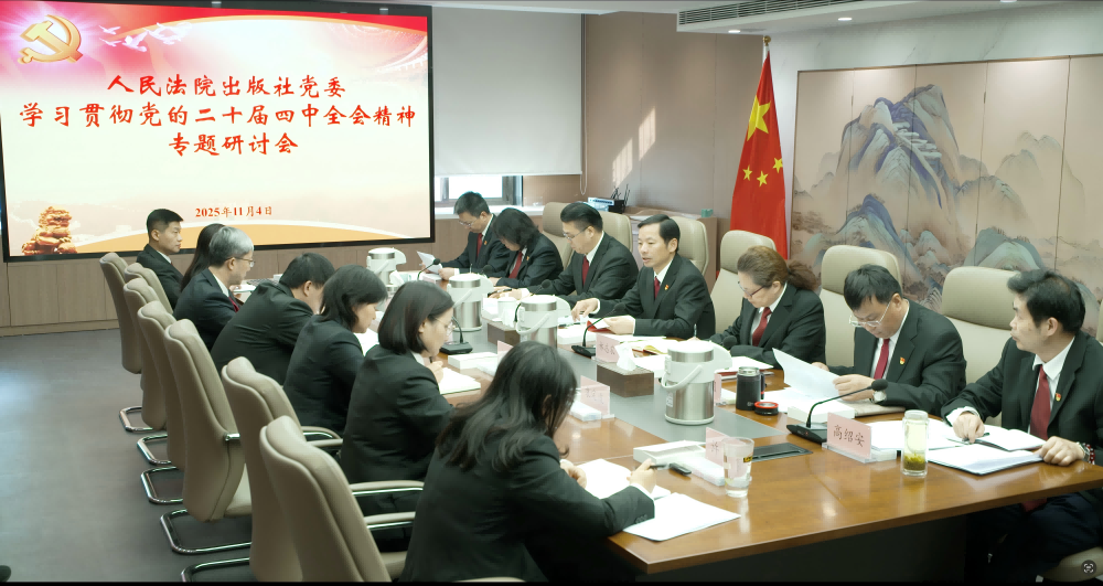 会议集体学习了习近平总书记在党的二十届四中全会上的重要讲话和全会精神,切实把思想和行动统一到党中央决策部署和全会精神上来。与会同志一致认为,人民法院出版社作为最高人民法院直属的中央文化出版企业,肩负着传播法治思想、服务司法实践、繁荣法治文化的重要使命,必须坚持以习近平新时代中国特色社会主义思想为指导,深入践行习近平法治思想、习近平文化思想,坚定拥护“两个确立”、坚决做到“两个维护”,按照党中央决策部署和院党组部署要求,紧密结合服务司法审判工作实际,推动全会战略部署在人民法院出版社不折不扣落实到位。
