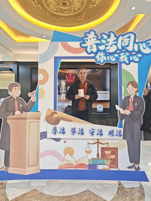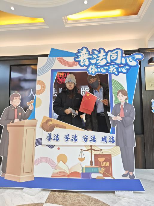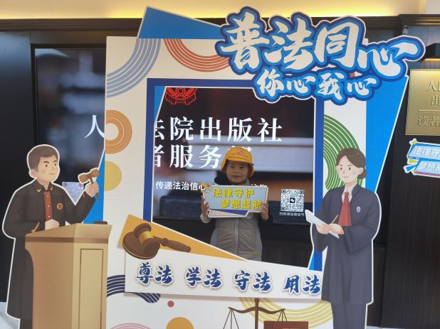 法信书店在核心区域打造“宪法与生活”专题书展,集中陈列《中华人民共和国宪法》及相关法律读物、民法典解读、法治教育普及类图书,构建系统化的法治学习资源矩阵。展区同步设置 “普法同心 你心我心” 互动打卡点,融合法官形象、法槌等法治元素,搭配趣味合影框,吸引读者手持国家宪法日主题读物拍照留念。该设计既延续书店 “以书载法、以景融法” 的特色,也契合年轻群体偏好,成为活动亮点之一。